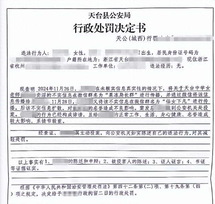 2024年11月,一则关于浙江台州天台县某中学女教师“卖淫被抓”的传言在微信群中流传,后该信息被天台县公安局确认不实,三名涉及传播该信息的女教师构成诽谤,被处以行政拘留。